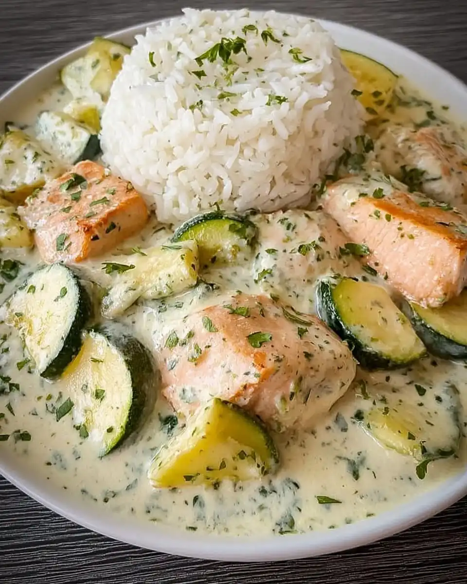 Ein warmes und cremiges Gericht mit Lachs, Zucchini und einer aromatischen Kräuter-Frischkäse-Sauce, serviert mit fluffigem Basmati-Reis. Perfekt für entspannte Abende.