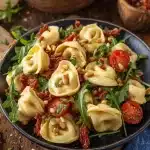 Der Clou? Die Kombi aus weichen Tortellini (quietschende Glücksmomente, ehrlich), cremigem Mozzarella, dem würzigen Kick von getrockneten Tomaten und dem crunchigen Pinienkern-Finale. Und das Dressing… Tja, ich habe ein bisschen getüftelt, weil ich leichte Säure will, aber kein langweiliges Zuviel. Dazu Rucola und frischer Parmesan – es wird wirklich nie langweilig.